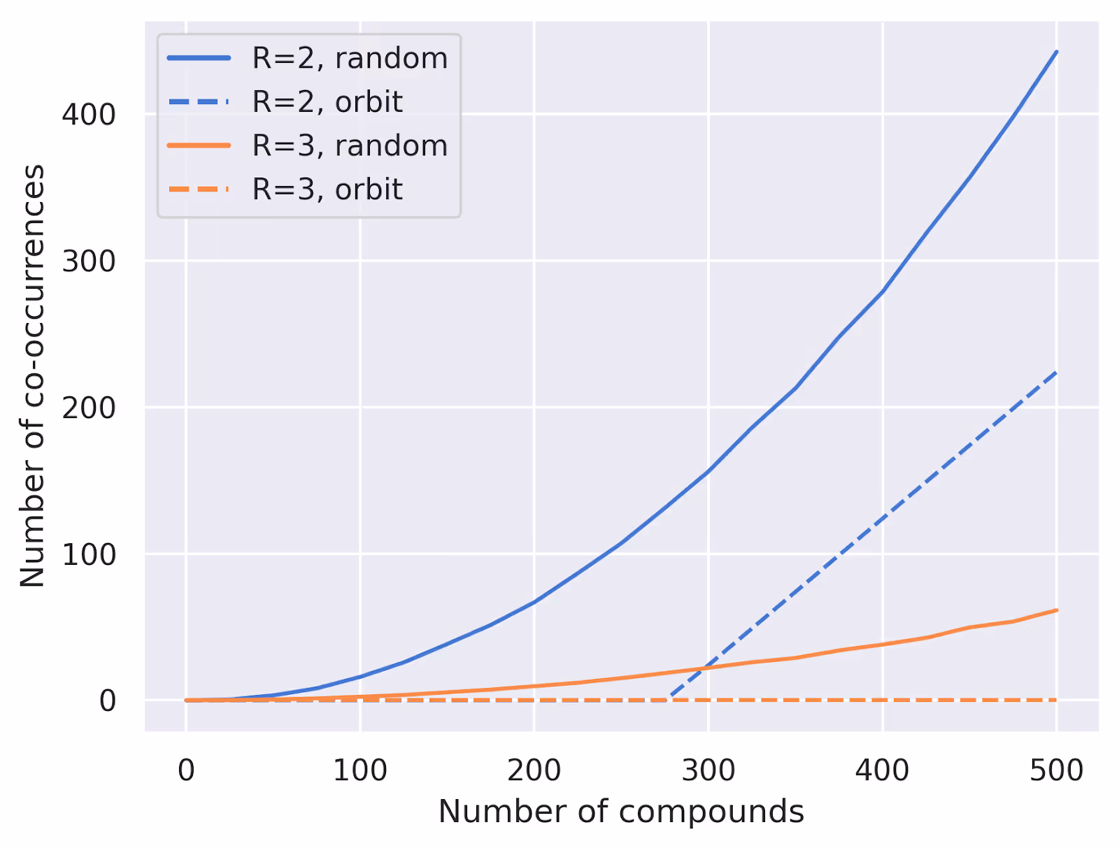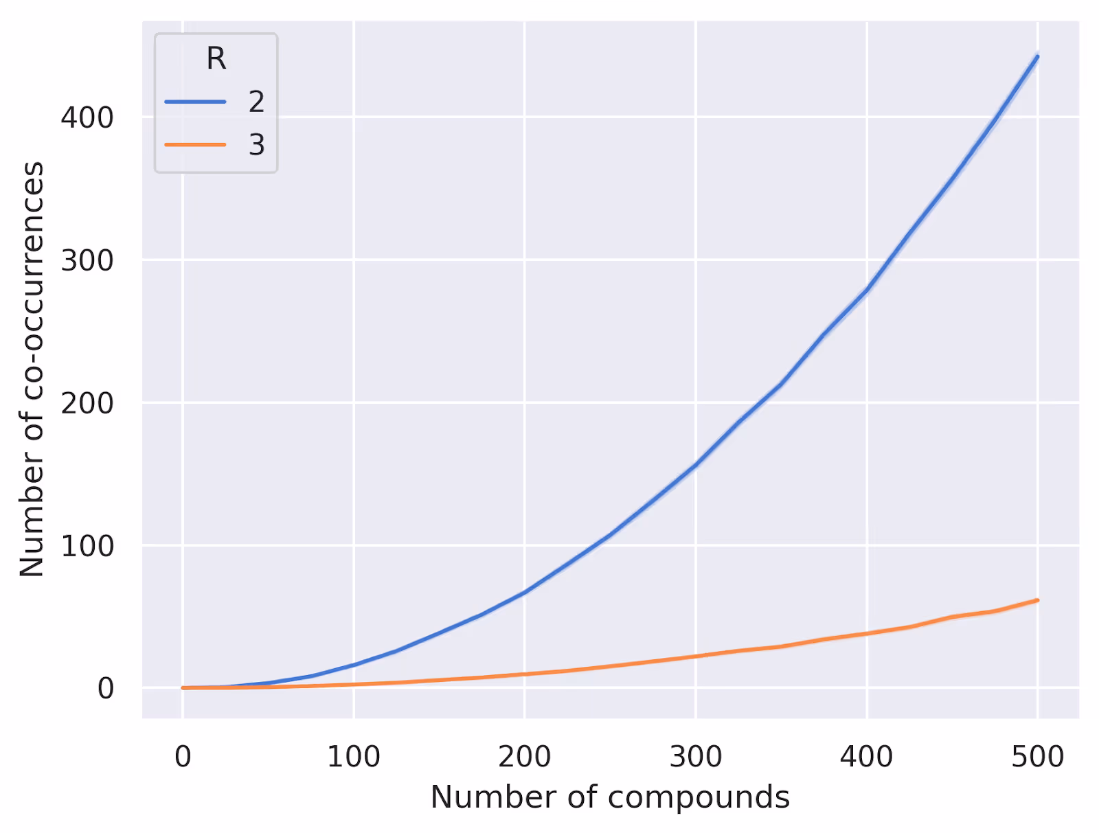 return plateThis will fill our plate compound by compound, trying to keep the wells as evenly filled as possible. We can test this out numerically for a few different parameter settings to see how well it performs. Below we've plotted some results for $W=24$, $R=2$ and $R=3$ replicates, varying the number of compounds from 0 to 500. We're plotting the average number of compound pairs that always appear together in the same wells over 100 random trials:
