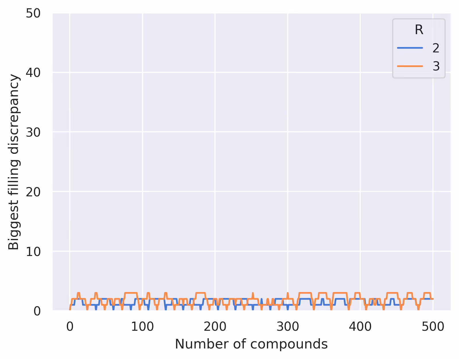 As expected, our systematic approach guarantees no overlaps until we exceed the total number of unique combinations, while the random approach starts to show overlaps much earlier. We can also see that, using this method, we never have a difference between most- and least-filled well greater than $R$: